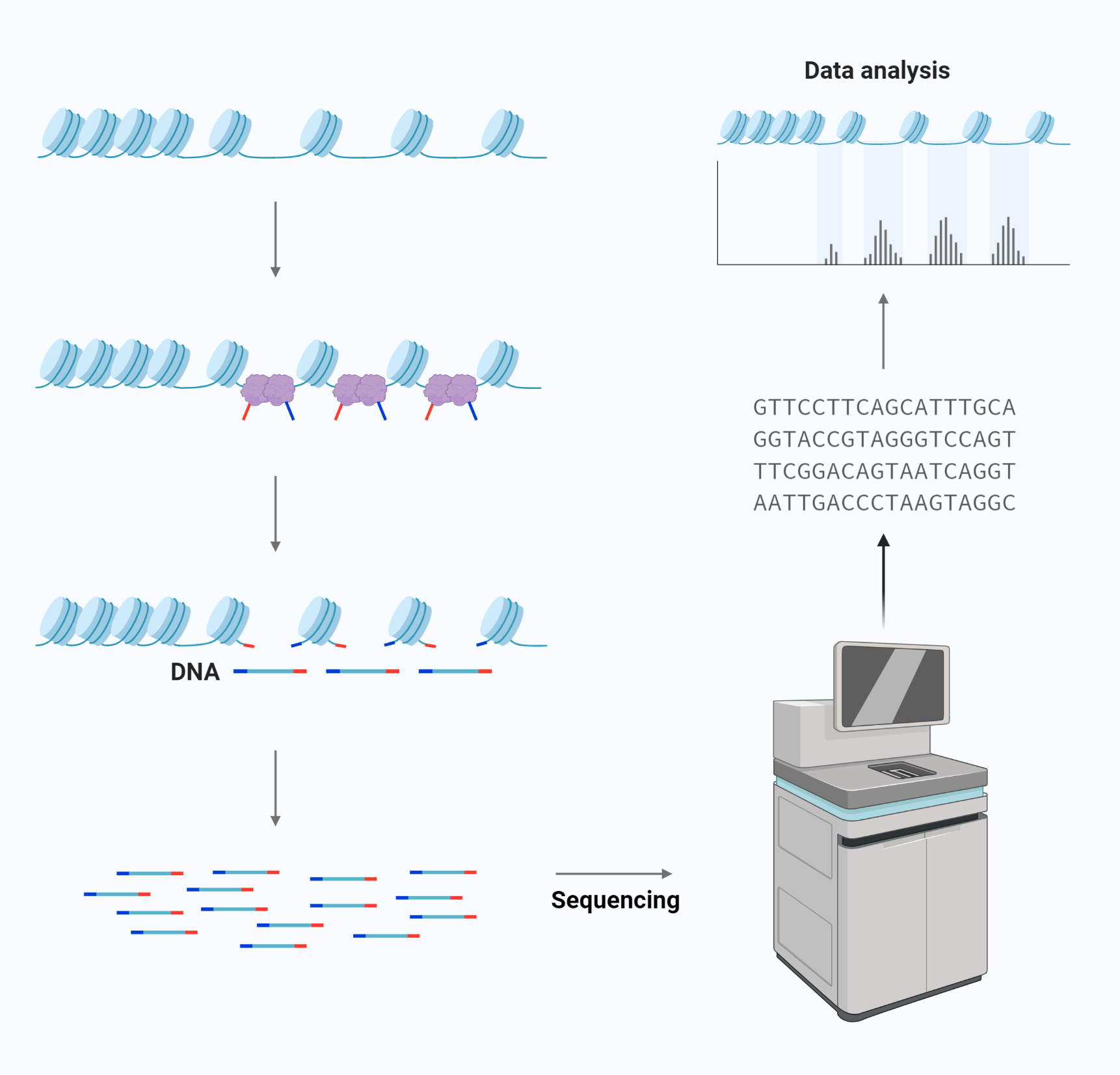 그 후, 태그가 붙은 DNA 단편을 정제, PCR증폭, 시퀀싱을 수행합니다.