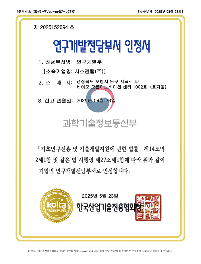 - 제 10-2697561 호 (2024년) 간암 진단을 위한 바이오마커 조성물